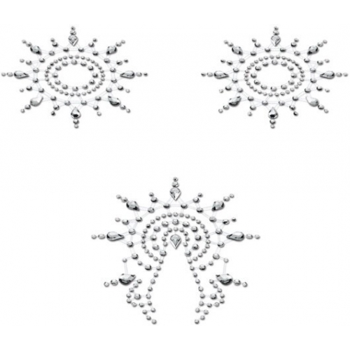 В комплект входят 2 наклейки на соски и 1 наклейка на лобок из множества кристаллов,