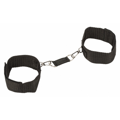 Размеры: ширина оков - 5 см, длина оков - 33 см, размер регулируется при помощи застежек на липучке, соединены между собой двумя карабинами - длина 14 см.