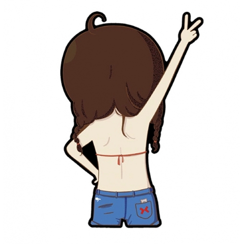 На наклейке изображена анимированная девушка, показывающая рукой жест в виде буквы V.
